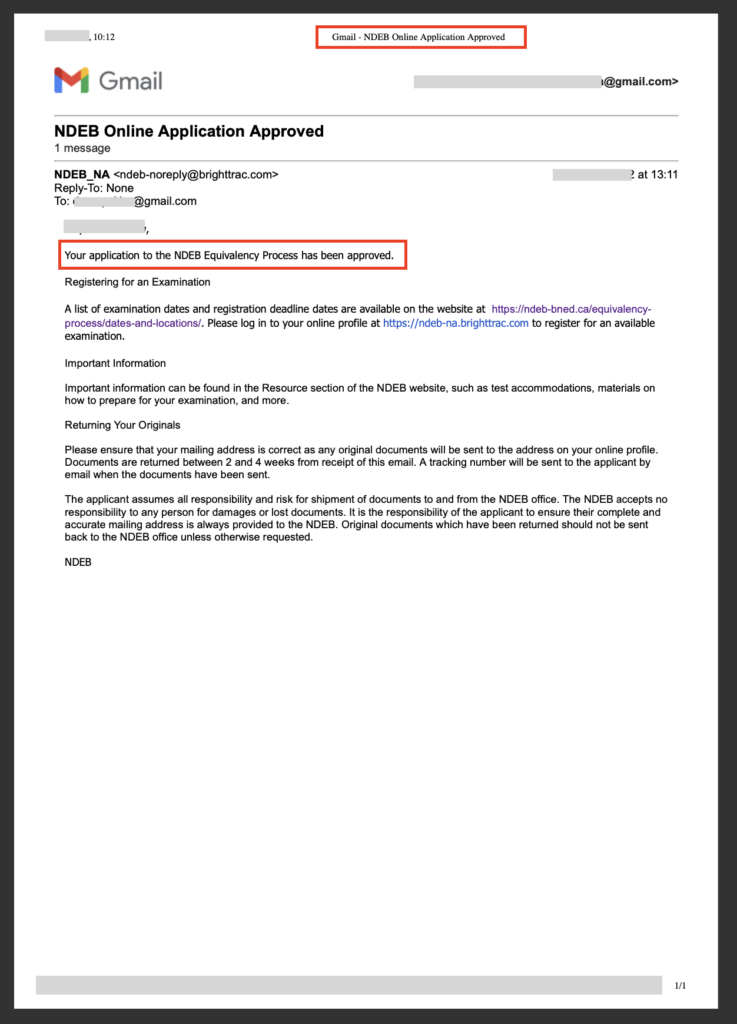 - Screenshot of NDEB Equivalency approval email,